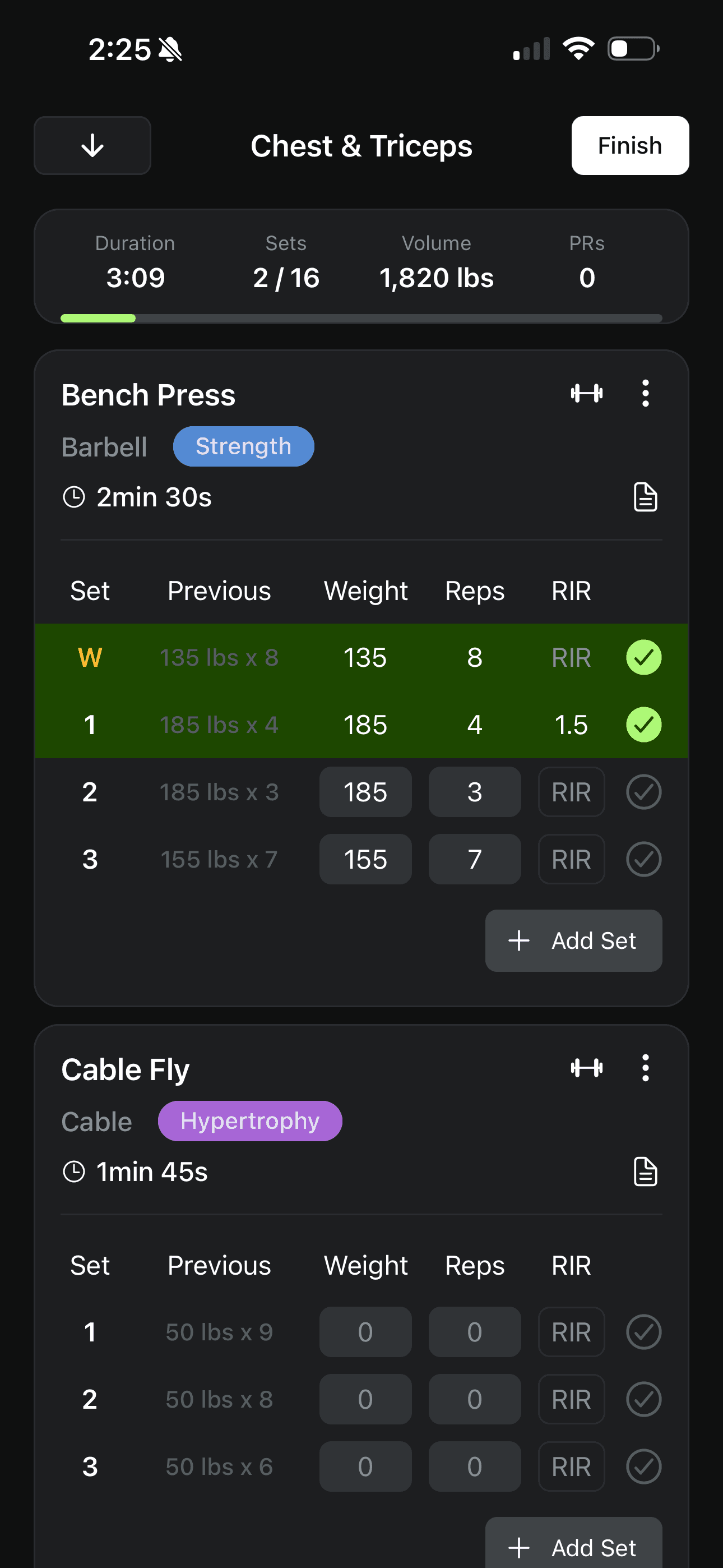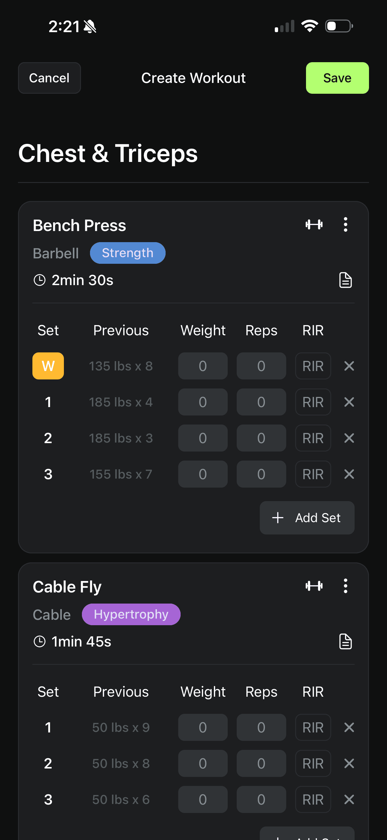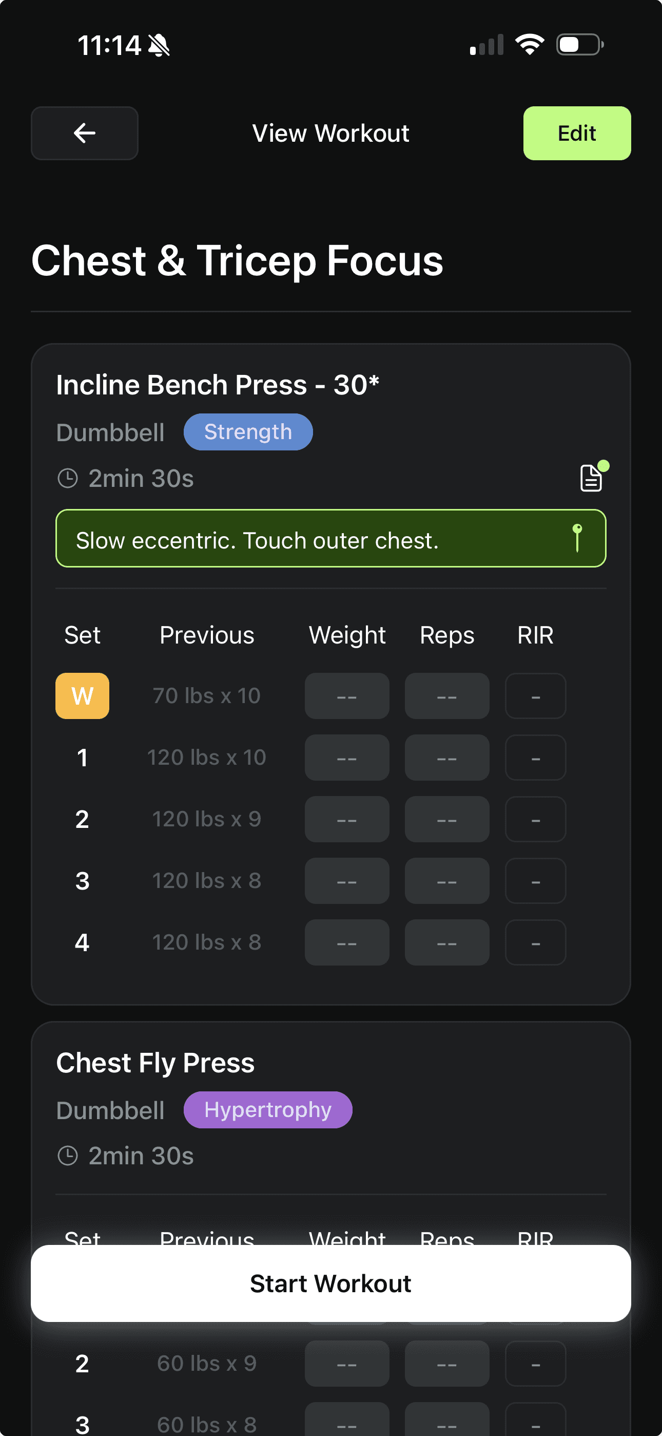 Create workout templates tailored to how you train. Warm-ups, working sets, drop sets, myo-reps - all supported. Save them. Refine them. Repeat them. Your programming, your way.