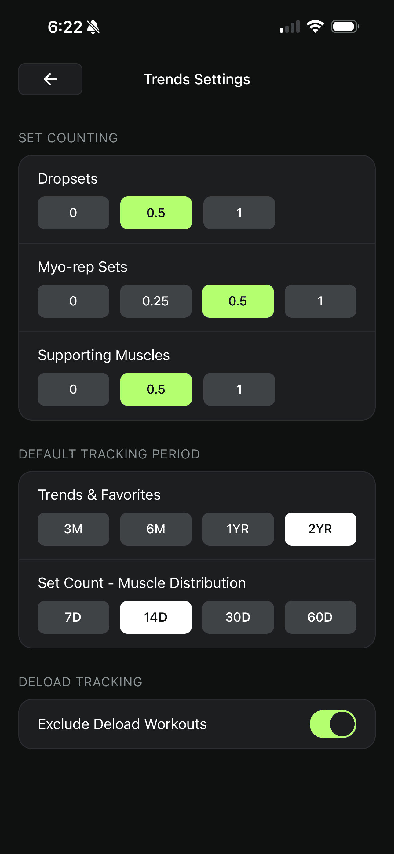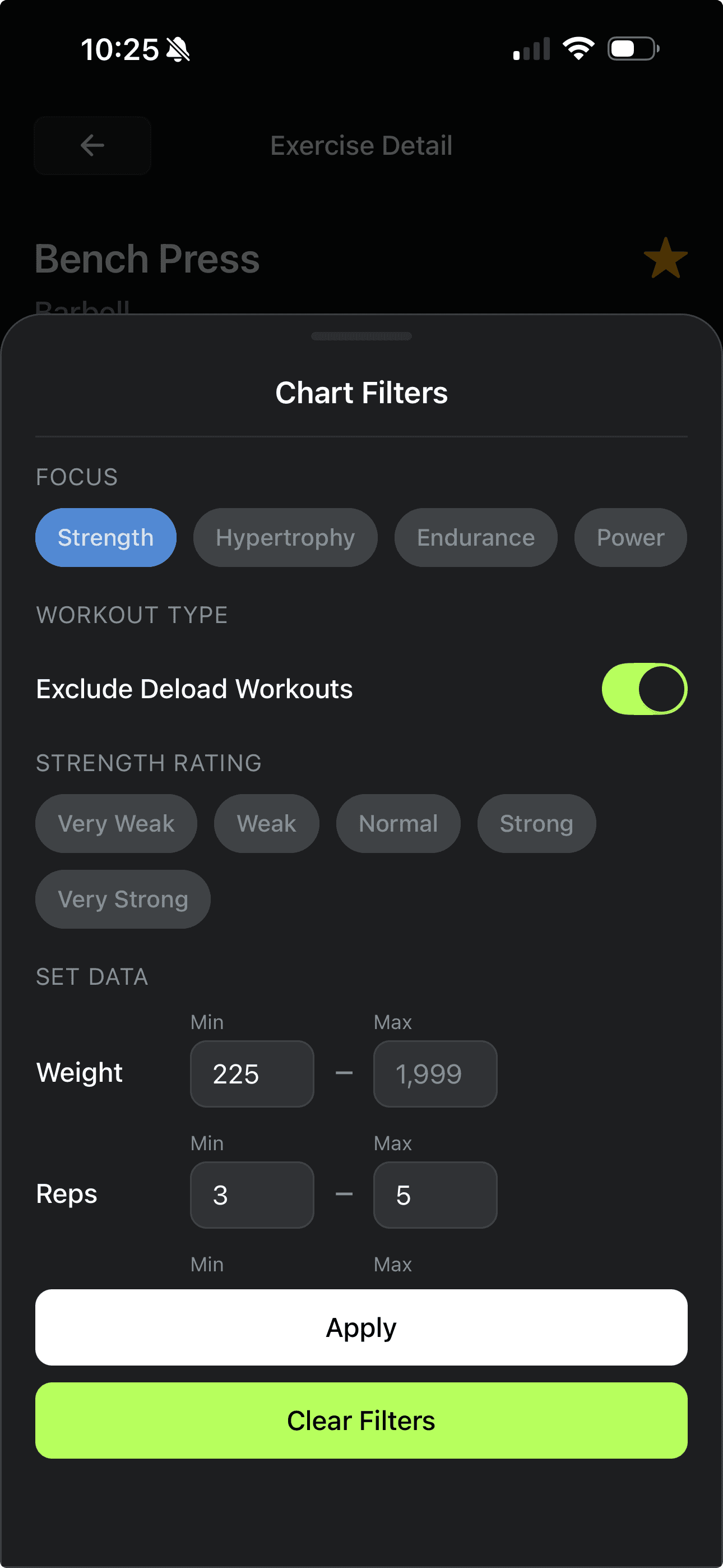 Tag any workout as a deload, then flip one switch in your settings to automatically exclude every deload session from your progress charts.