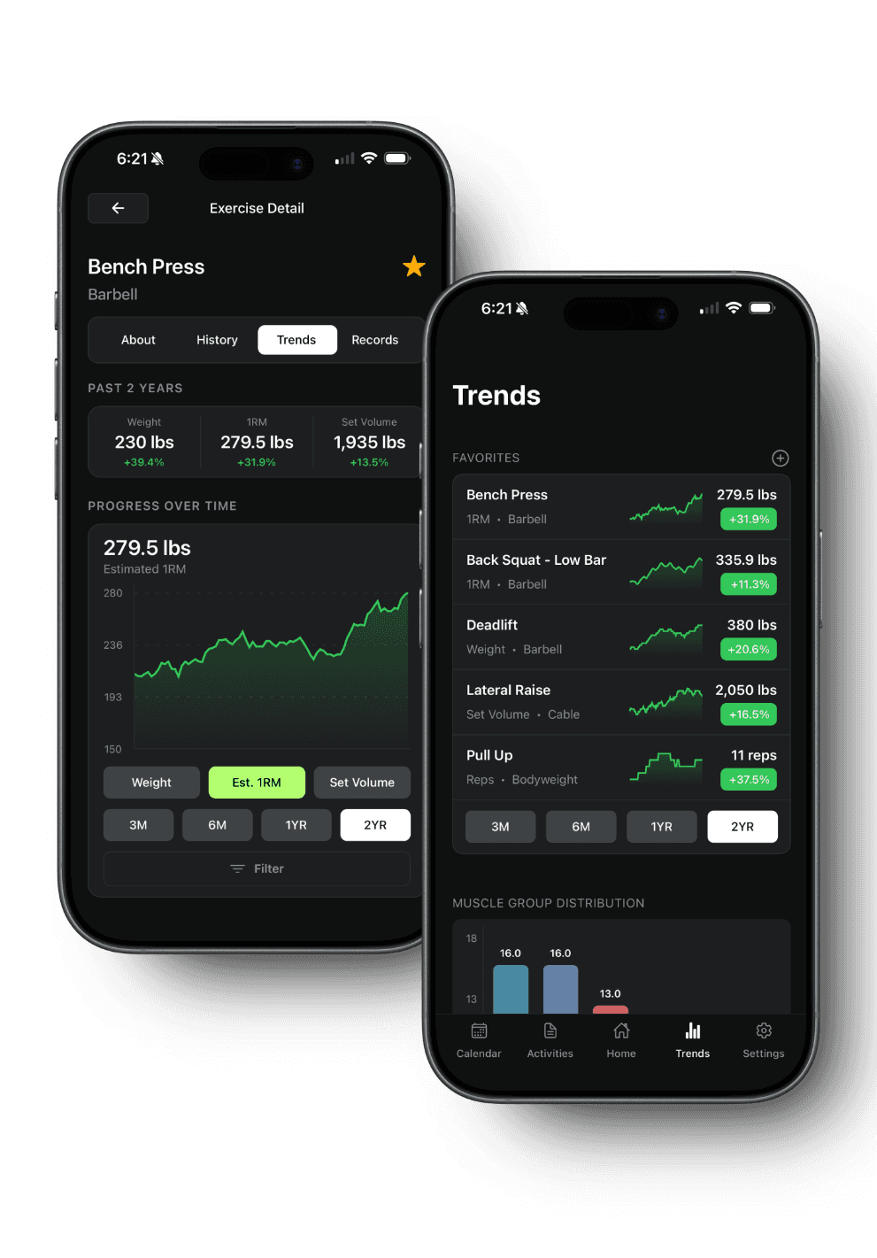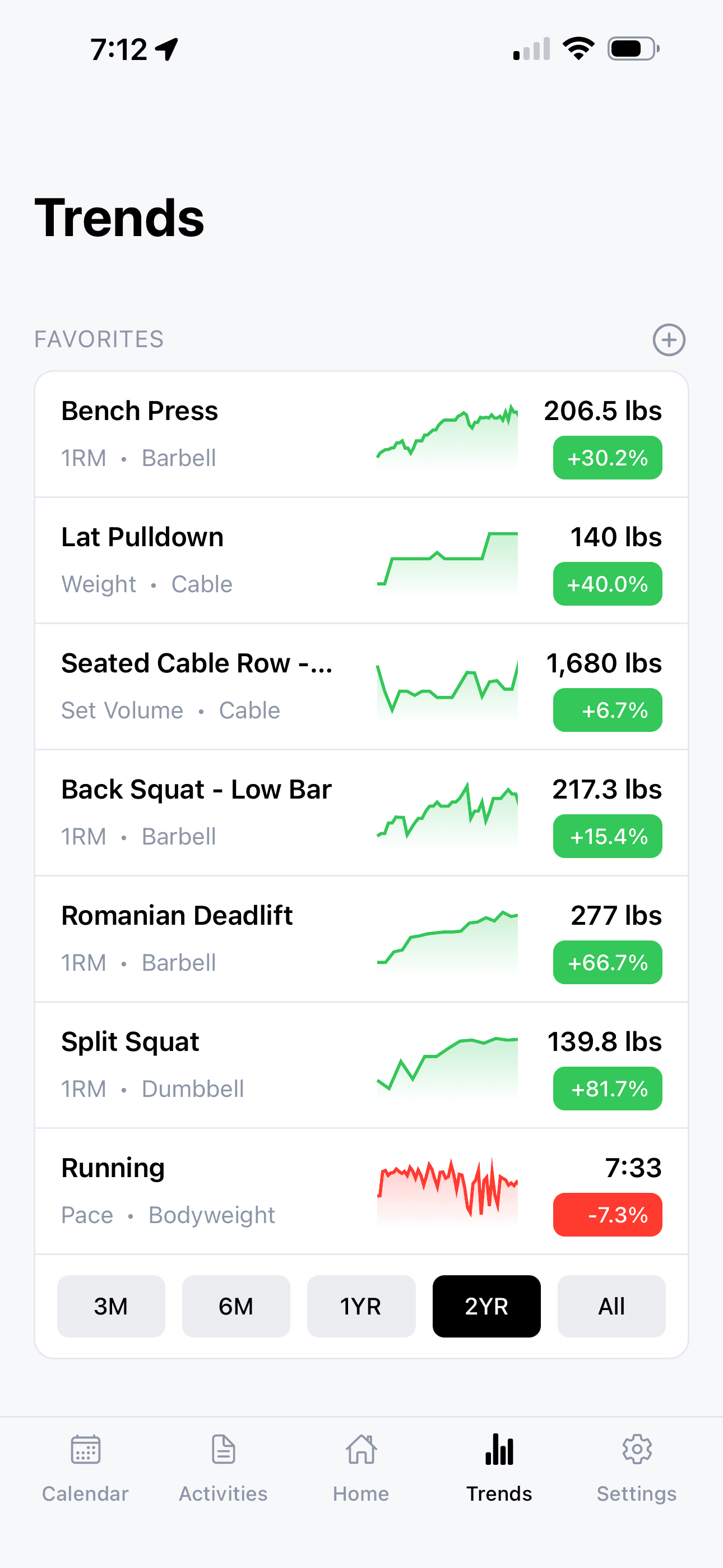 Choose what metric you care about for each of your favorite exercises - weight, set volume, or estimated 1-rep-max.