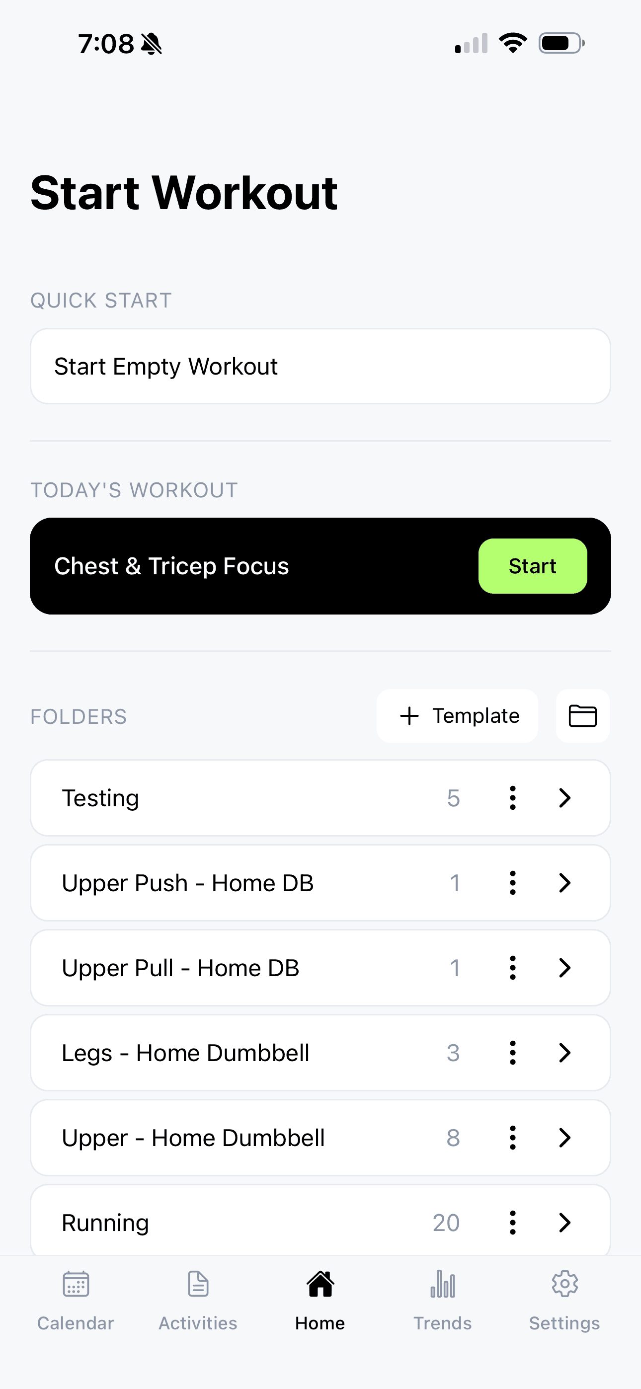 Open the app. Your planned workout is waiting on the home screen. One tap to start. No folders. No searching.