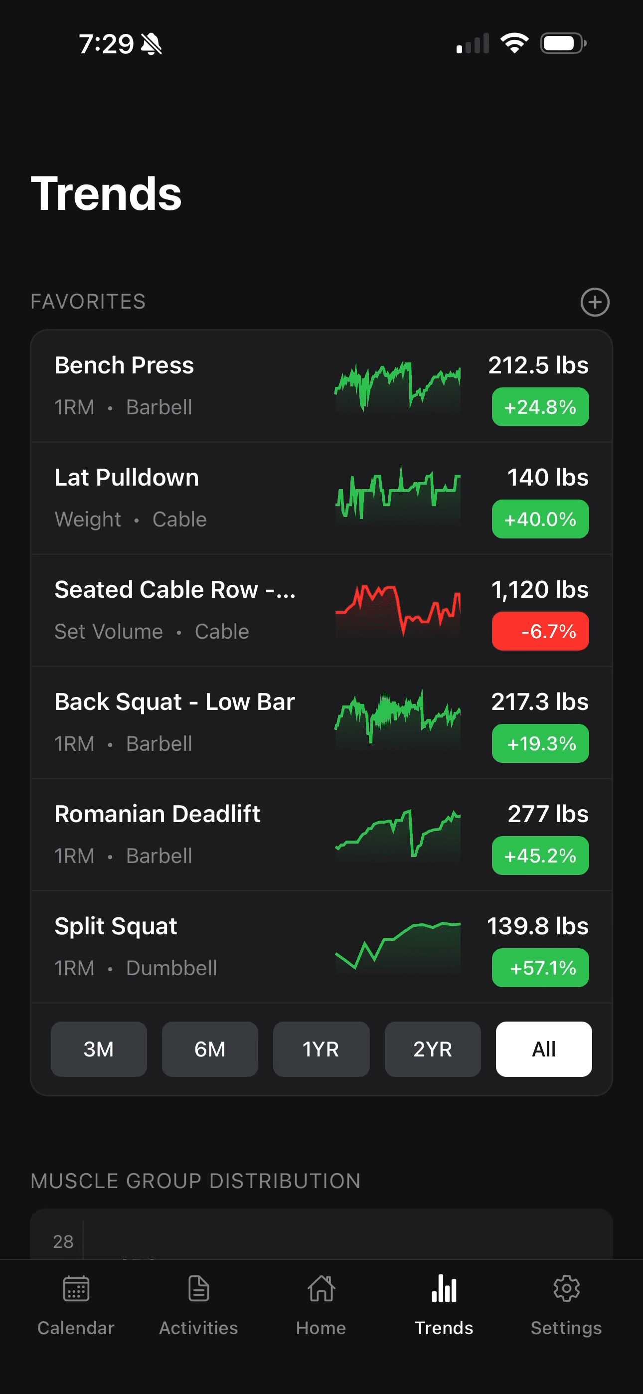 See exactly how many effective sets you're doing per muscle group over 7, 14, 30, or 60 days.